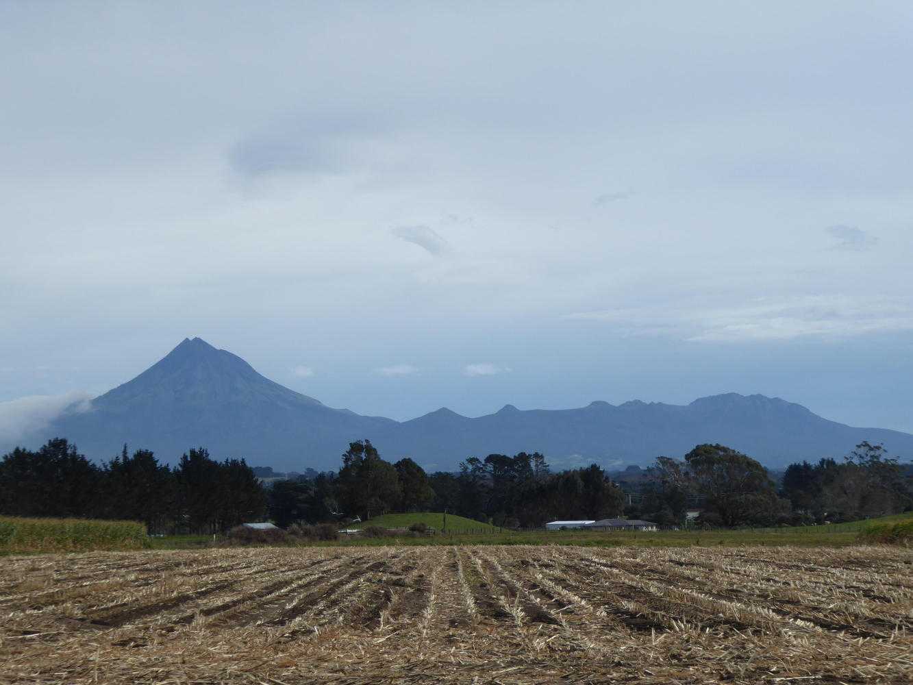 Fortunately, we were soon able to get onto some minor roads and wiggle an extra 10K to get to New Plymouth in safety. Trying to ride into the headwind was quite comical, and the tailwind was incredible! I was freewheeling at well over 25 km/h. By this point, we were also being treated to fabulous views of Mt Taranaki, which saw fit to emerge from the clouds and keep our spirits high. That, and being alive!